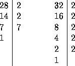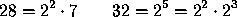 En el caso del ejemplo anterior, se ve que el único factor común es 2, y está elevado al cuadrado en 28 y elevado a la 5 en 32. Se toma entonces como M.C.D.